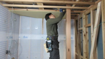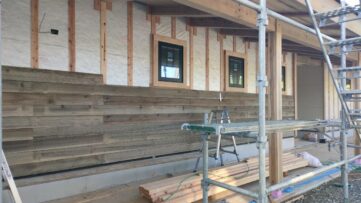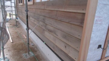 新築モデルハウス ☆ 外壁 板張り こんにちは!平です!暖かい週末になりましたね。みやま市モデルハウス新築工事の現場では、木工事が続行中です。 内部では、天井板張り、下がり壁の下地が進みました。 外部では、戸袋下地、外壁の板張りが着々と進められています。よろい張り... 2025.11.15新築
