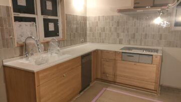 こんにちは!平です!今日は予報通りに、午後から雨になりましたね。みやま市モデルハウス新築工事の現場では、システムキッチンの据付が完了しました。  L型のシステムキッチンです。今回は、ウッドワンさん。木目の扉が優しくて、壁のタイルと、床の無垢...