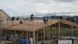 木工事は、T中Y大工さんと村崎さんコンビ!軒天下地組をやってくれました。そして板金工事はTナカ板金さん。今日は壁の角波張りを進めています。