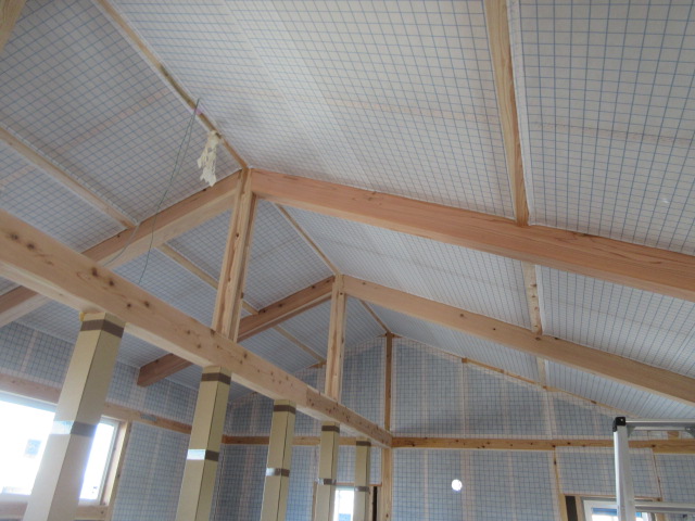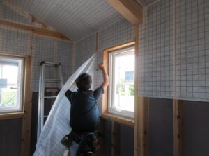 断熱工事は、T永産業(株)さんからのO樹さんです!2階の屋根断熱シート張りからの壁断熱シート張りへと進んでいきます。この中にセルロースファイバーが明日から吹き込まれていきます!パンパンに(*^▽^*)