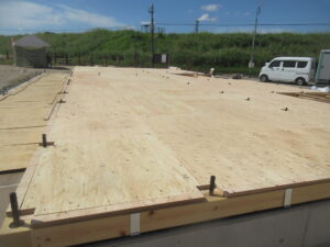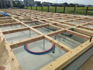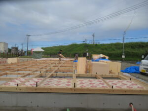 みやま市モデルハウス新築工事の現場では、上棟前の床組工事が進みました。