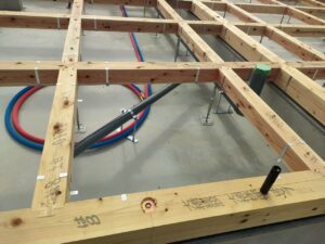 碁盤目のようになった床組のマスの中に、断熱材を入れていきます。まずは、断熱材受の金物を設置していきます。