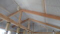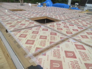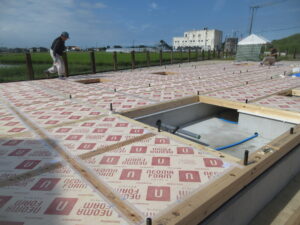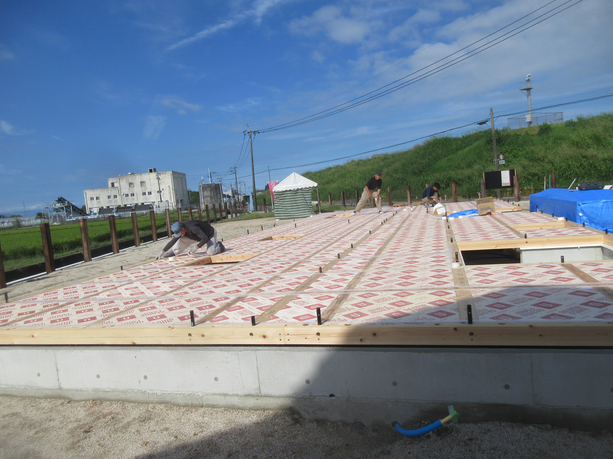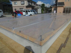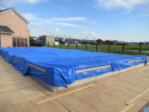 そして、汚れ防止としてフィルムを張りました。今日の作業の最後には、ブルーシートでしっかりと養生しました。上棟まで、この状態ですので、少しでも、雨が入りにくいようにしています。
