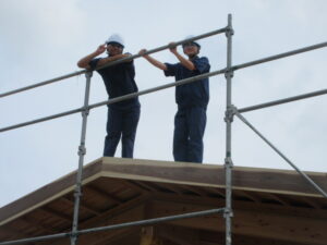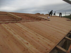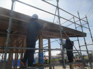 午前中は、屋根の野地板張りチームと、屋根先化粧材の破風板、鼻隠しの取付チームに分かれての作業が進められました。