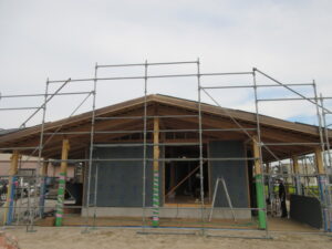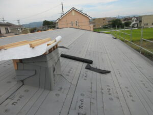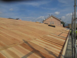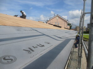 午後からは屋根のルーフィング張りをS末製瓦のS末さんにより張り進めて頂きました。