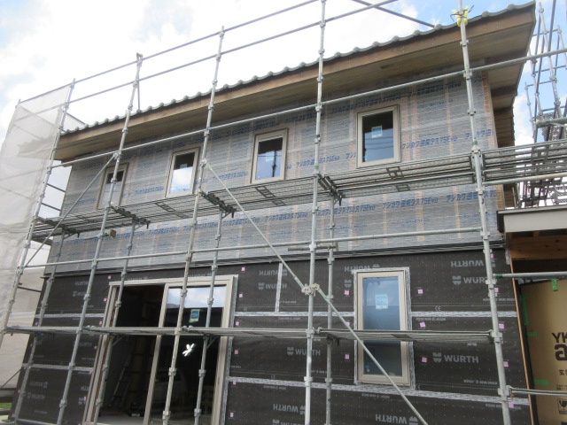 外壁工事は、2階廻りのジョリパッド塗り下地の通気ラス張りが半分完了!明日、すべての通気ラス張りが完了して1日(水)から左官さんによるラスモルⅡ下地塗りが始まります。なんとか間に合いそうなんで良かったです(*^。^*) 明日は、4人態勢で外壁通気ラス張りを完了予定です!K様、引き続きよろしくお願い致します。