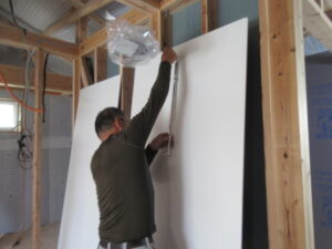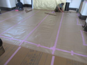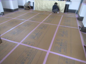 玄関前のタタミ敷き部分は、養生シート張りの上、養生ボード張りをやっています。今日も屋内の蒸し暑い中、私(高山)と平さん、そしてTけし美装のM籐さんの3人態勢で養生完了しました!正面の大仏間は高さが4mを少し超していて脚立に道板はやはり危険が伴うと判断して、明日からの足場ステージ組が進んだ状態で養生しましょう!となりました(;^_^A