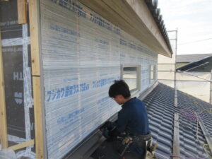 木工事は、河口さん、T取大工さん、O大工さん、小川さんの4人態勢です。明日からの左官工事前に通気ラス張りが完了しました(≧▽≦) 2階廻りの外壁はジョリパット塗り仕上げ!その下地のラスモルⅡを明日、左官さんが数名来てやってくれるそうです。仕上げが楽しみですね! K様、引き続きよろしくお願い致します!
