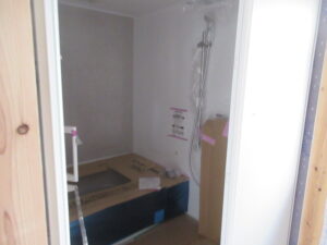 昨日のシスバスの仕上がりはこんな感じです。モノトーン仕上げ(*^▽^*)格好良いですね~。そして木工事ですが、今日は河口さん、午後から村崎さん、T中大工さんで倉庫棟の外壁下地打ちを進めています。下地打ちが終わると倉庫棟の足場は解体するようです。外壁小波板(カラーガルバ)を張るには足場はない方が良いとの事です!K様、引き続きよろしくお願い致します。