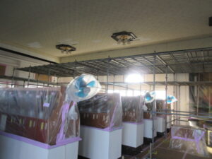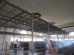 足場工事は、(株)K-セツさんです!今日は3人態勢でステージ組を進めてくれています。明日は4人態勢の様ですので明日で完了します!との事です。一応3日間の予定でしたが2日間で完了します。6日(月)からはいよいよ天井材の撤去を始めます!N納骨堂様、引き続きよろしくお願い致します。