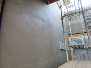 今日からK林工業さん(左官さん)が5人態勢でラスモルⅡを塗ってくれています。通気ラスにラスモルⅡを塗り込み、メッシュを張ってもう一度ラスモルⅡを塗ってジョリパッドの下地モルタルの完成です(≧▽≦) 明日も引き続き、ラスモルⅡ下地を塗っていきます。
