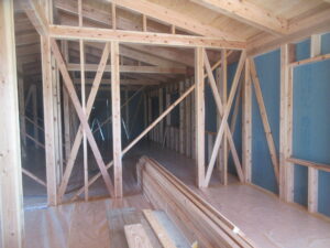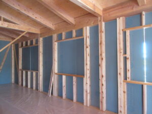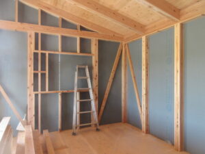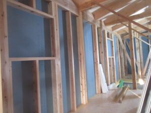 T取大工さんによる内部木工事。開口部廻りの下地や、構造上必要な斜め材の筋違(すじかい)も入ってきました。