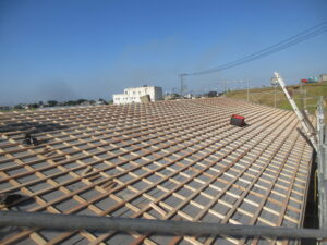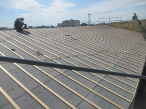 屋根工事では、屋根下地の上に全面ルーフィング張りをした上に、縦桟木が施工されていきます。