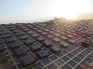 この横桟木の上に瓦が伏せられていきます。もし、瓦が割れて水が浸入した場合でも、横桟木の下に空間がありますので、縦桟木沿いに水が下へと流れて行きます。これも、安心施工のひとつです。