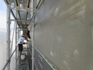 左官工事は、K林工業さん!今日は6人態勢で外壁ラスモルⅡ塗りを進めてくれています。残りは南面の2階部分のみとなりましたが、材料が揃うのが月曜日中との事なので火曜日の作業となりました!良い感じで下地が出来上がっています。