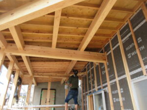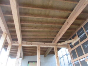 木部塗装は、S匠塗装さんです。キシラデコール塗り仕上げです。屋根の野地合板とタルキ、桁梁、柱、土台の塗装となります。K様、各工事ともステ木な仕上がりとなっています。引き続きよろしくお願い致します。