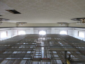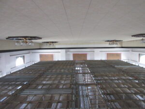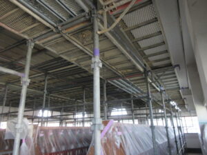 足場ステージに登るとこんな感じです!来週からこの天井材の全撤去をしていき、クロス貼下地のベベルボードを全面に張っていきます。ホコリ、ゴミがなるだけ下に落ちない様にブルーシートは敷いて作業をしてもらいます!村崎職長!がんばってくださいね(*^。^*) N納骨堂様、引き続きよろしくお願い致します。