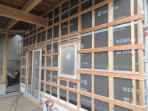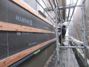 木工事は、河口さんとO大工さんコンビです!今日は倉庫棟の通気胴縁打ち。倉庫棟はガルバの小波板張りになります。住宅棟は杉板のタテ張り(大和張り)どちらもタテ張りになるので横胴縁が基本ですね(*^▽^*)