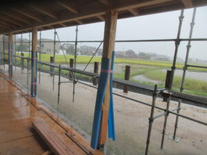 豪雨の時の様子です。屋根に落ちた雨が一斉に地面へと落ちていく様子が、まるでカーテンのようでした。下屋部分が広いので、室内に雨が降り込むことはありません。