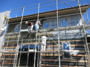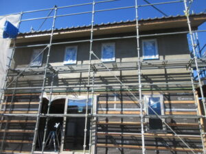 外壁ラスモルⅡ塗りは、K林工業さんの3人衆です。今日は下地塗りまで完了!金曜日あたりに仕上げ塗りをする予定です!K様、引き続きよろしくお願い致します。