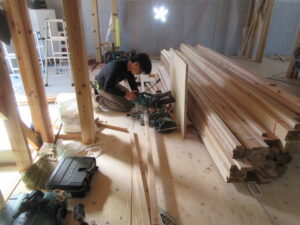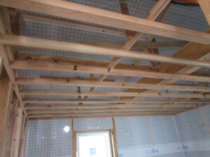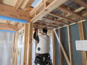 木工事は、河口さんが一人で頑張ってくれています。今日は天井下地を進めてくれています!明日も、1階の続きと2階の天井下地を進めます。
