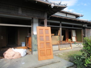 解体工事は、Kガ信工業さんです!今日は4人態勢で住宅の建具撤去から始まりました!明日、外部シート足場の設置と重機搬入して境界ブロック解体、植栽撤去、伐根等を進めていきます。T様、引き続きよろしくお願い致します。