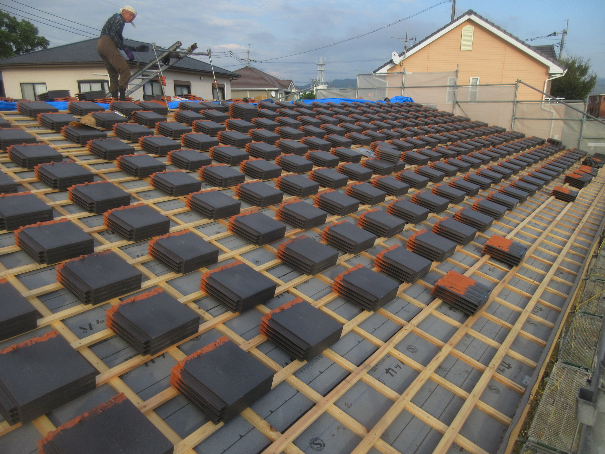 屋根の先(軒先)の瓦から、棟へ向け、順々に伏せられていきます。