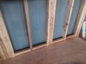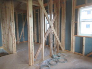 木工事では、室内の壁にボードを張りますので、その下地となる木材を打ち進めて頂いています。