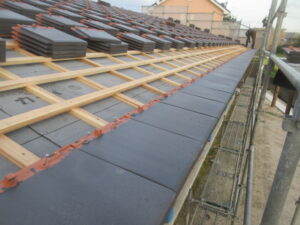 屋根工事では、南側に伏せられる瓦が全て上げられました。瓦下地の桟木施工も完了しました。