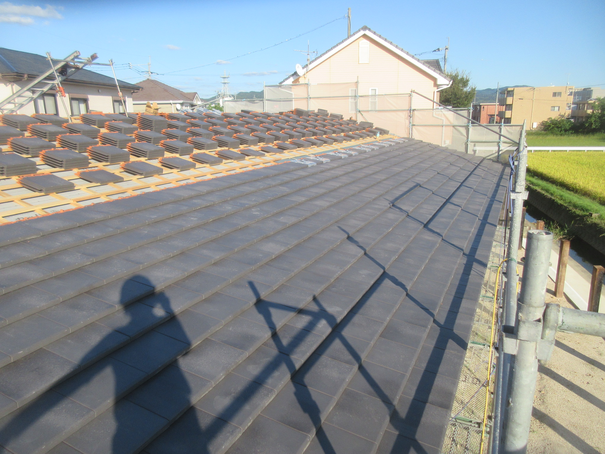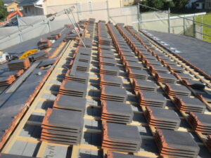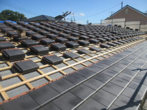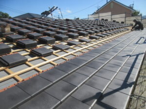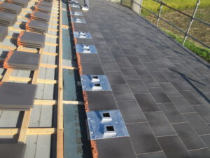 伏せられた瓦の中に、異色の物がありますが、これは、太陽光パネルを設置するための下地フレームを取り付ける支持瓦というものです。