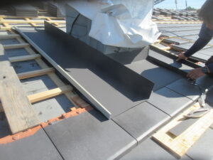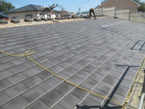 屋根工事の瓦伏せが、棟付近まで進みました。煙突廻りの水切りが、板金屋さんにより取り付けられましたので、煙突廻りの瓦伏せも進みます。来週初めには、瓦屋根工事が完了する予定です。