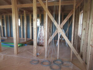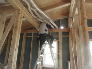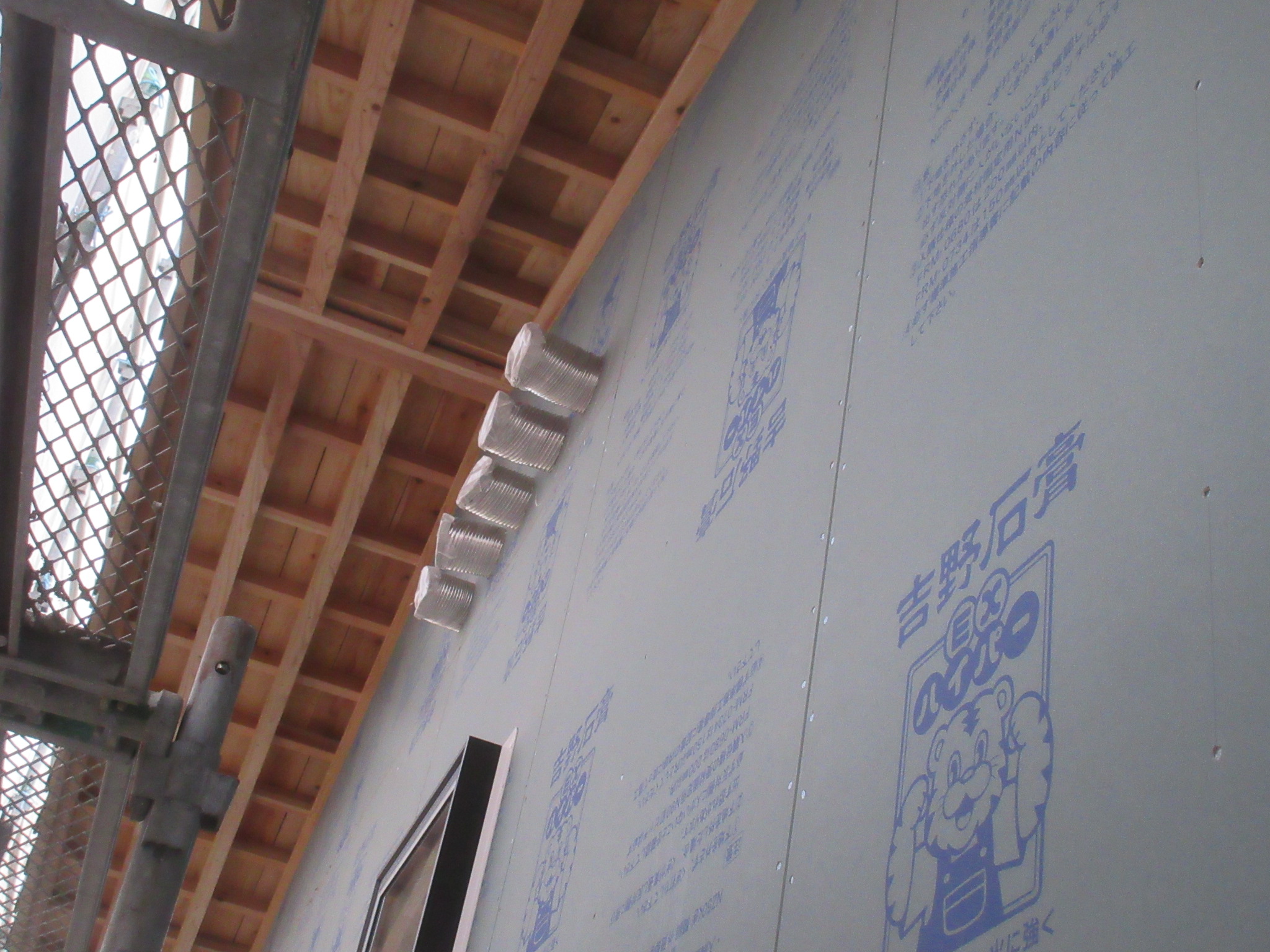 内部の電気配線工事も、U都宮電気のU都宮さんにより、進めて頂きました。ジャバラが小屋裏に通って外に出されていますが、これは、換気の通路となります。来週も引き続き、配線工事を進めて頂く予定です。