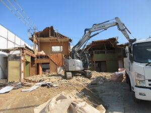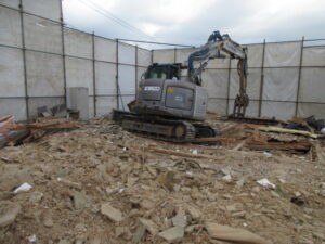 昨日、今日でアッという間に上屋の解体、撤去が終わりました!今日も、Kガ信工業さんが3人態勢で進めてくれました。あとは、どろ壁の土と木材の分別、それが終わると基礎の解体へと進みます。上屋解体が終わったのでいよいよ足場シートの撤去も明日以降進めれるようです。T様、引き続きよろしくお願い致します。