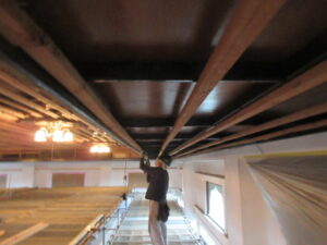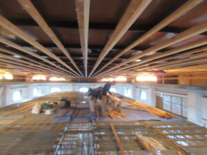 柳川市 N納骨堂様天井改修工事 ですがこちらは既存天井補強、つり上げ、下げ工事が終わり、今日から新規下地組が始まりました!