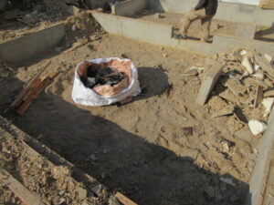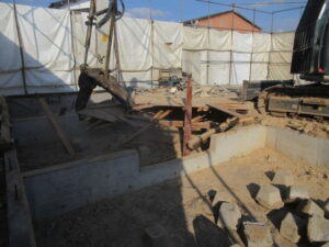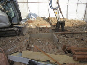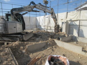 今日も、Kガ信工業さん!3人態勢で進めてくれています。上屋が取れて床にどろ壁の土、外壁モルタル、しっくい、木材などが混在しています。この中から木材だけを分別していきます。