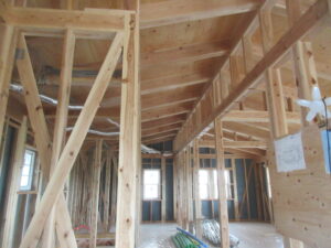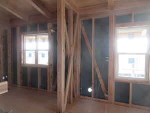 スイッチ、コンセント、エアコン、換気扇、給気口、キッチン、浴室の電源、照明等々のいろんな配線や、ジャバラ状のダクト(換気の通り道)があります。まずは、外壁廻りの配線を進めて頂いています。