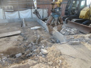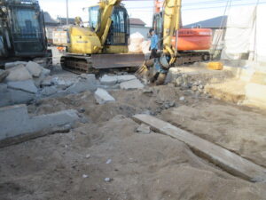 今日も、Kガ信工業さん!3人態勢で頑張ってもらいました。朝から基礎コンクリート(布基礎)の撤去解体です。重機でバリバリと砕いていきます。