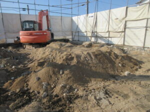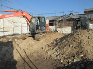 土間コンクリートハツリ部分にからむ布基礎だけ残してほぼコンクリートは撤収。基礎内の残土撤収も進めています。明日、外部足場シートの撤去をして引き続き土間コンクリート撤去、浄化槽撤去へと進めます。T様、よろしくお願い致します。