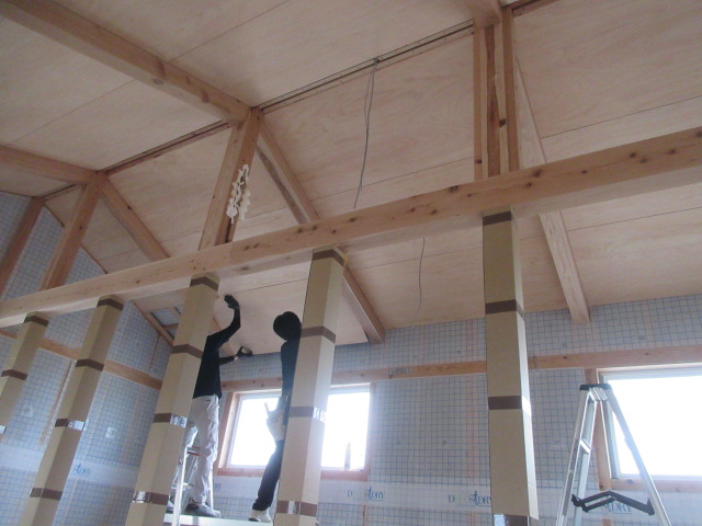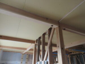 木工事は、河口さんと今日は助っ人の小川さんです。2階勾配天井の桧合板目透かし張りが完了し、1階のオガファーザークロス下地のベベルボード張りも進んでいます。明日以降もベベルボード張りを進めます!K様引き続きよろしくお願い致します。