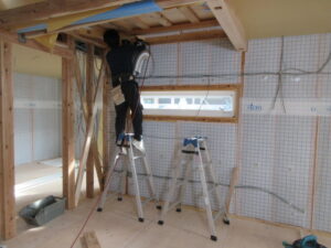 木工事は、今日も村崎さん、O大工さん、T中大工さんトリオです。昨日から始まった下がり天井のボード張りもじゃんじゃん進んでいます。明日の午前中は村崎さんだけですが、頑張って進めていきましょう。明後日、土曜日にボード張り完了と片付け、清掃、撤収まで終わる予定です。N納骨堂様、引き続きよろしくお願い致します。