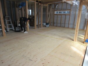 木工事は、河口さんです。今日はキッチン壁ふかし後、LDKの材料を片付けていよいよ無垢(杉)フローリング張りの段取りが始まりました!
