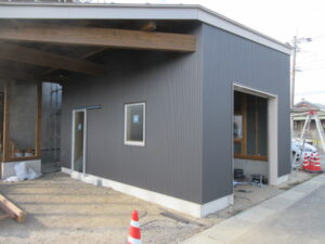 倉庫棟の外壁工事は、Tナカ板金さんです。今日で外壁カラーGL鋼板小波板張りが終わりました!通称「トタン」なんですが材質と色でガラッと雰囲気が変わりこれはこれでオシャレですね~(*^。^*) K様、引き続きよろしくお願い致します。