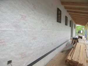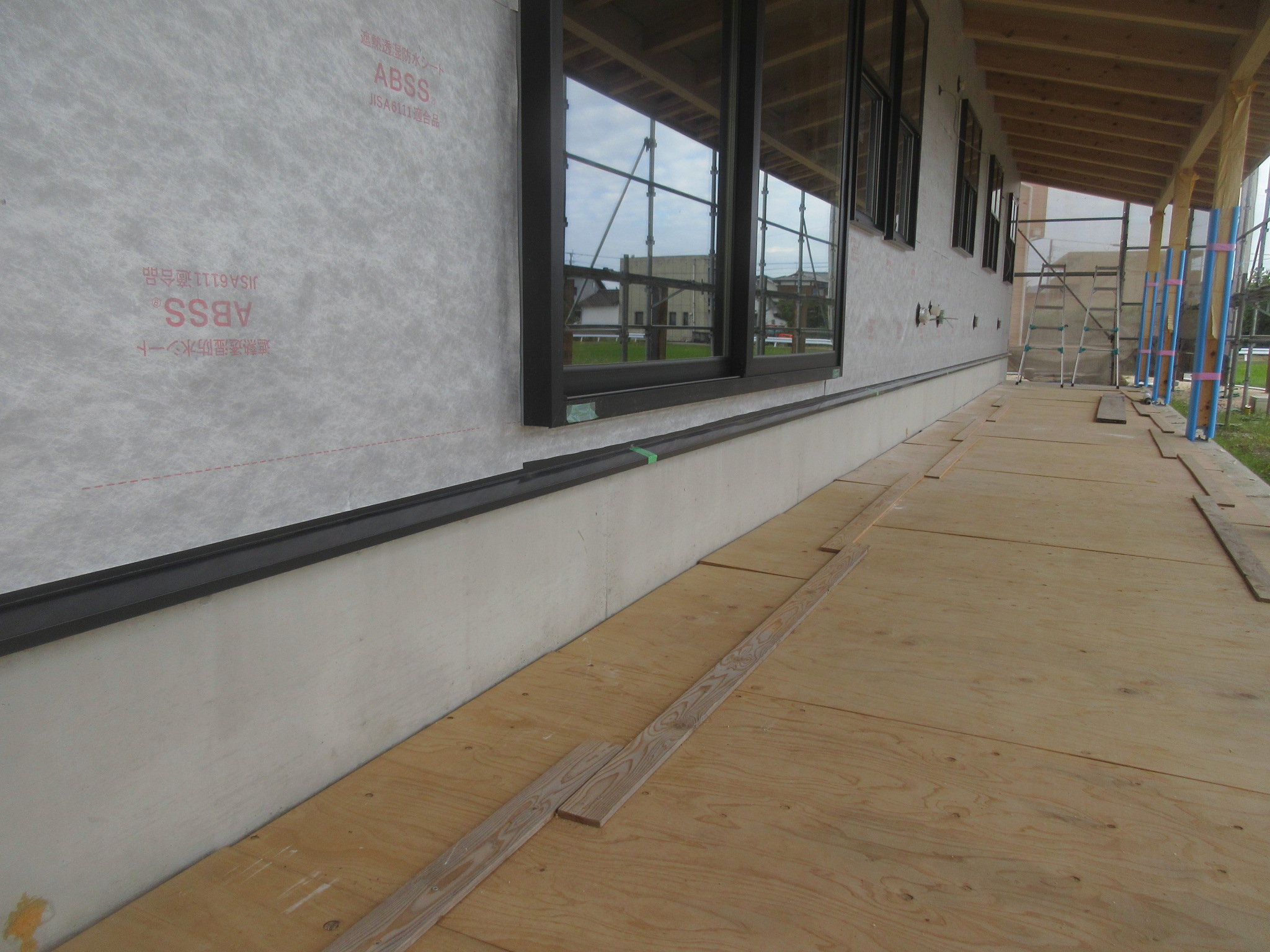 今は、水切りがずいぶんと出っ張って見えますが、この水切より上の部分には、壁下地の胴縁を施工したあと、壁板が張られていくので、ちょうどいい具合になってきますよ。