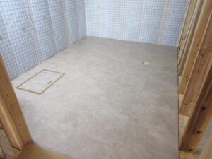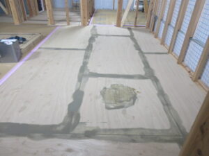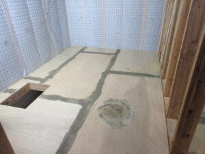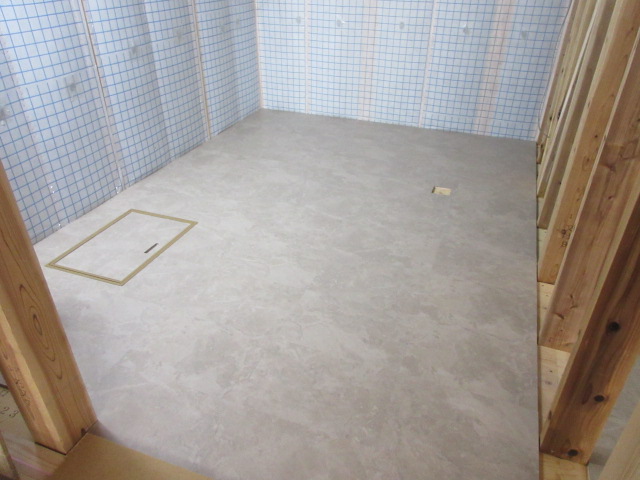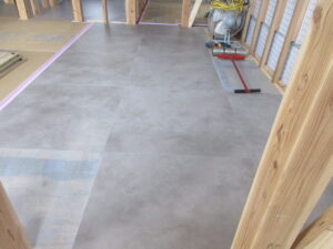 内装工事は、Tけし美装さんです。今日は床職人さんが来てくれています。キッチン床、トイレと納戸の床はフロアタイル張りです。そしてキッチン床は900角のフロアタイル!職人さんも数回しか施工したことがないと言う代物です!脱衣室と洗面はCFシート張りです(*^。^*) K様、明日も引き続き木工事を進めていきます。よろしくお願い致します。