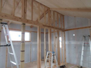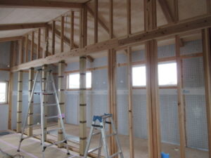 木工事は、今日も河口さんです。2階の真壁間仕切り下地入れからのボード張りへと進んでいきます。