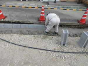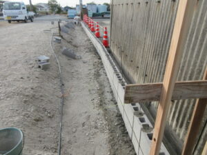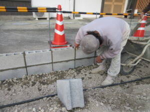ブロック積工事は、K林工業さんのお二人です。朝イチからベースコンクリート打設を行い、ブロック積が始まりました。