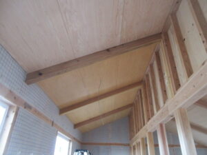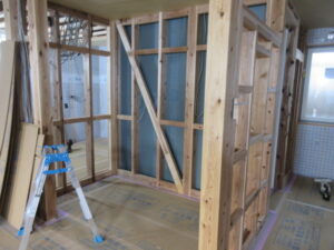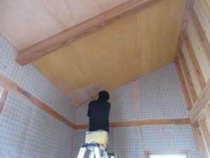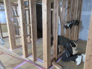 木工事は、河口さんです。今日は1階のボード下地当て材の取付を進めています。