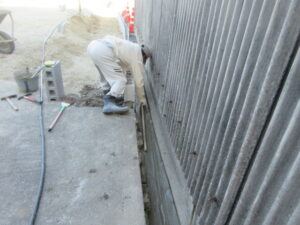 夕方には、天端モルタル詰め、隣地土間取合いモルタル詰め、清掃片付けまで完了しました。T様邸から見るとブロック1枚から2枚にかけて埋戻しを来週頭に行う予定です。しばらくブロックのモルタルが乾燥するのを待ち、養生完了後に埋戻し、整地、転圧まで終える予定です。T様、もうしばらくお待ちください。