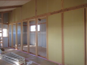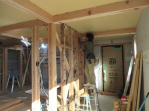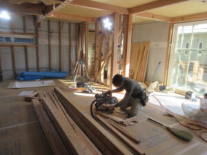 木工事は、今日も河口さんです!今日も1階のボード下地当て材入れを進めています。2階の化粧木部の塗装が終われば2階の壁下地バ板打ちへと進めます。