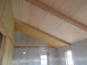 2階の化粧木部の塗装も吹抜部と、柱、梁の塗装完了!フリースペースも天井材と登り梁の塗装があと少し残っています。今週には2階は完了予定です。K様、引き続きよろしくお願い致します。